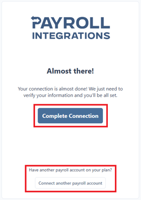 10. If you do not have any additional payroll accounts to link to your integration, simply click on "Complete Connection." However, if you wish to connect more payroll accounts, please select "Connect another payroll account."